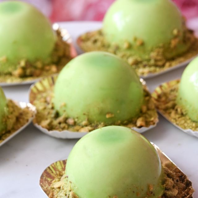 Rich, creamy pistachio mousse with a raspberry jelly centre, light duchesse sponge covered in a dreamy green miroir glaze.