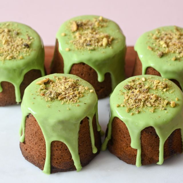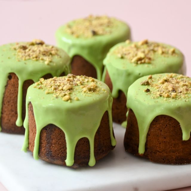 Moist pistachio sponge infused with hand-made pistachio syrup, topped with a delicious pistachio glaze.